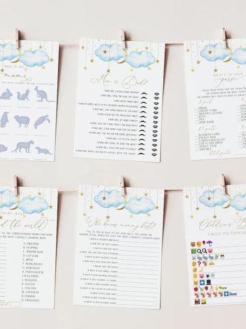 Printed baby shower games on cardstock. This includes 3 different games with 35-40 prints per game.